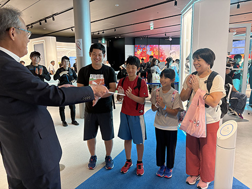 The 50,000th visitor was the Mukai family from Amagasaki City, Hyogo Prefecture. Attending their third Expo, they left home early in the morning to visit the Osaka Healthcare Pavilion, having made a same-day reservation. ‘We were surprised to be the 50,000th visitors to the Tsubaki booth, but it makes a wonderful memorial,’ they said happily. Taro (6th grade) and Hanako (4th grade) commented, ‘The flight experience was more fun than we imagined, and we felt excited about the world 25 years from now.’