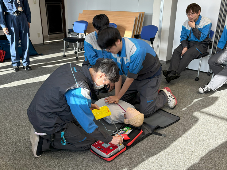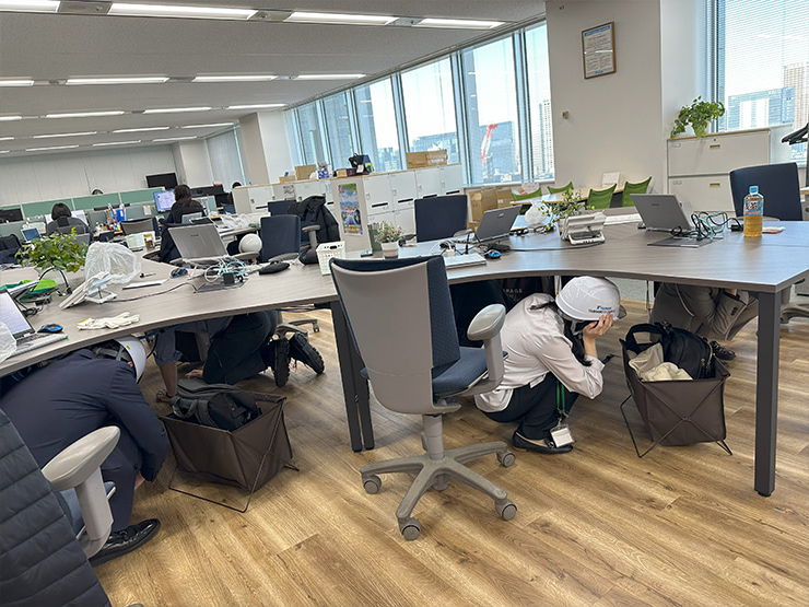 We conduct evacuation and fire-fighting drills at least once a year for both daytime and night-shift employees, covering a range of work schedules to reflect possible disaster scenarios. In FY 2024, we held evacuation drills and medical emergency training at the Tokyo Office, Nagoya Office, Toyota Sales Office, and North Osaka Sales Office, all located in high-rise buildings. In addition, we are strengthening voluntary activities in order to raise employee awareness of disaster preparedness.