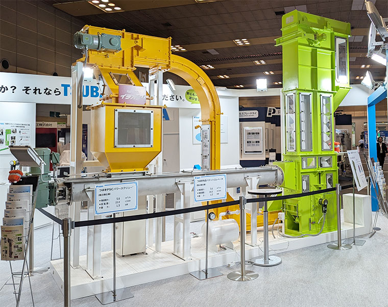 Under the theme "Still facing challenges? Leave it to TSUBAKI - we deliver reliable solutions and peace of mind", we demonstrated material handling using the TSUBAKI NFV Flightveyor, capable of transporting materials horizontally–vertically–horizontally with a single unit, the TSUBAKI NB Bucket Elevator for vertical conveying, and the TSUBAKI PSC Power Screw, a shaftless screw conveyor.