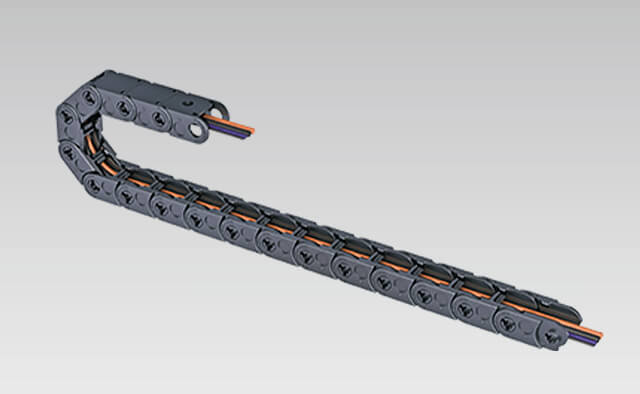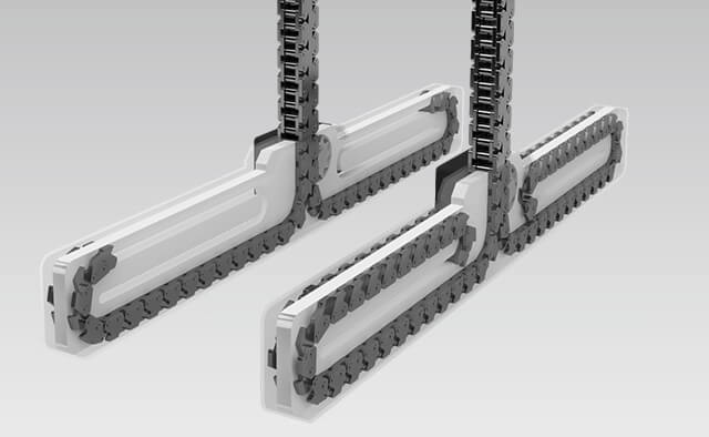 A “Zip Chain” is a unique product, independently developed by Tsubaki where two chains mesh together to form a rigid pillar shape.